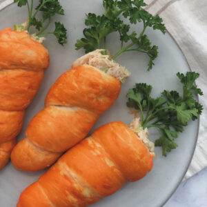 These adorable Easter Crescent Roll Carrots are such a fun way to celebrate Spring! They can be filled with your favorite chicken salad for the perfect Easter luncheon item! Use my Crescent Dinner Roll dough and pastry molds to shape these cute carrots. Find all the instructions below.