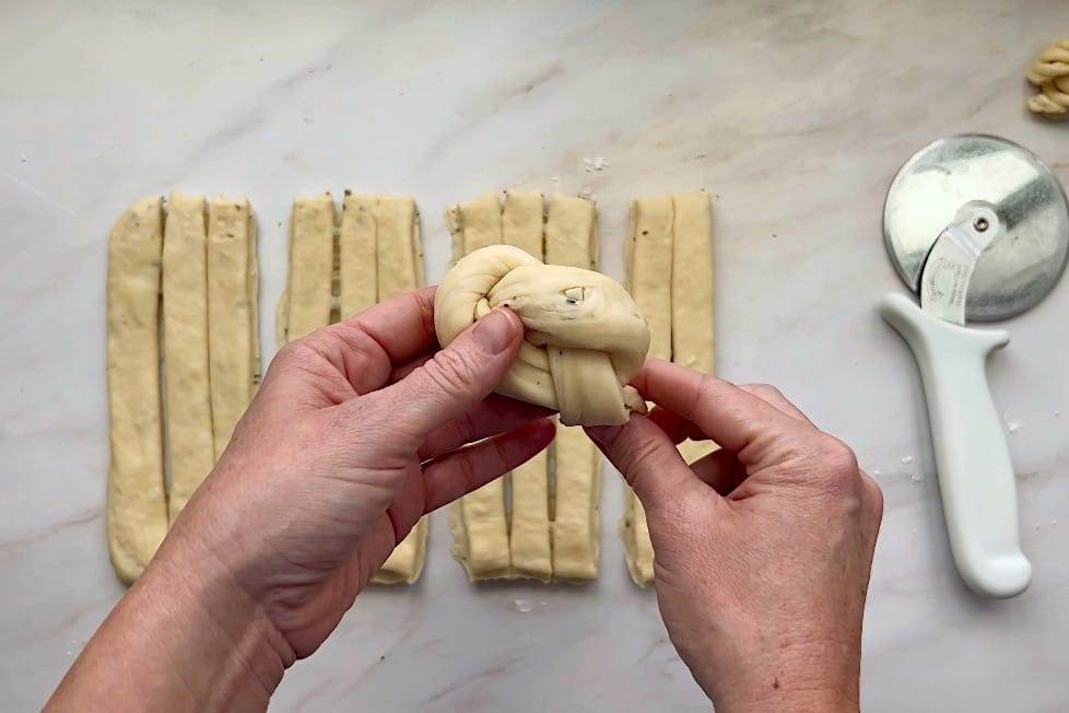 - Shaping the Rolls: Take one strip of dough and gently stretch it a bit. Take each end and tie a knot with the dough, folding the ends underneath the roll. Repeat with the remaining 11 strips of dough. Place each roll on a baking sheet lined with parchment paper, about 2 inches apart.