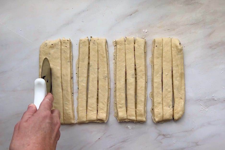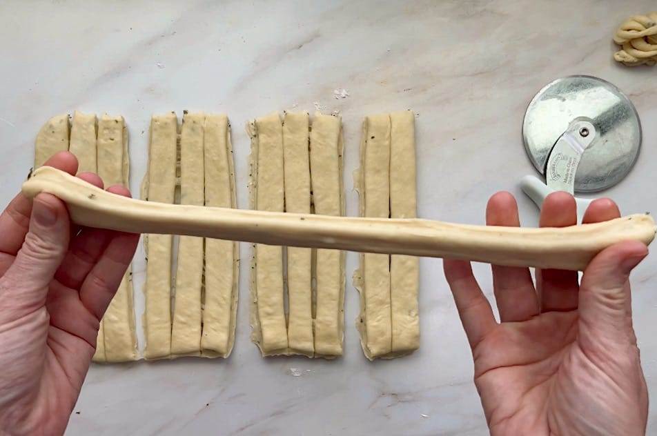 - Cut 12 equal strips of dough.