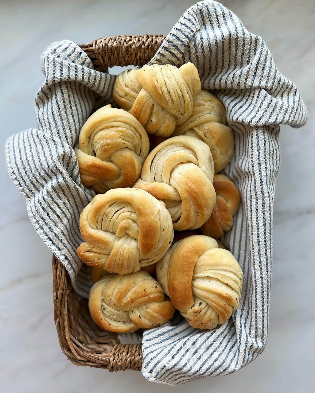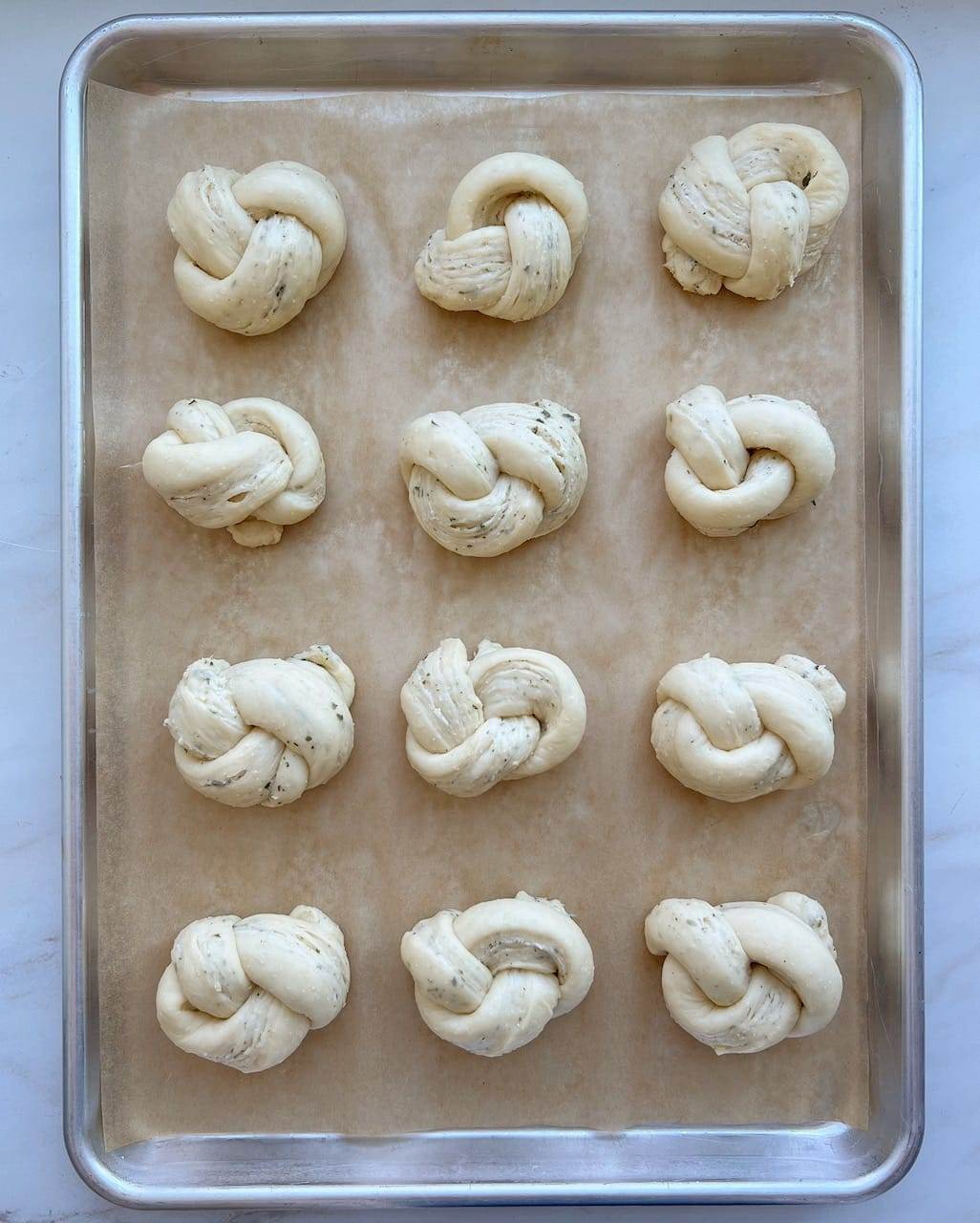 - *Be sure to watch the video on this post to see how to laminate the dough and tie the garlic knots.