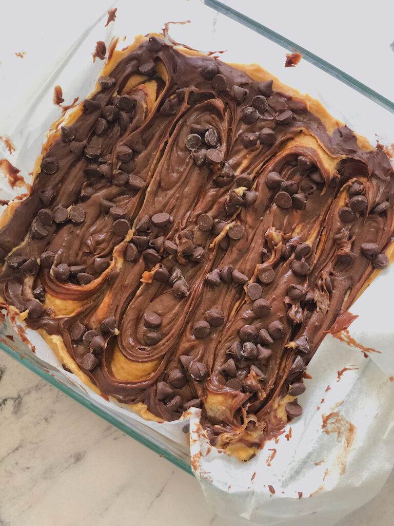 If you prefer to mix the flavors up a bit, use a knife to make some swirls with the batter. If you’d rather have more defined layers, then leave the swirling out. Either way, these brownies are going to be amazing! In this picture you can see I threw caution to the wind and created a few swirls. I like the way it looks when it bakes- being able to see swirls of the peanut butter layer mixed with the brownie. We eat with our eyes first – I like people to get an idea of what they are going to get when they pick a food to eat.