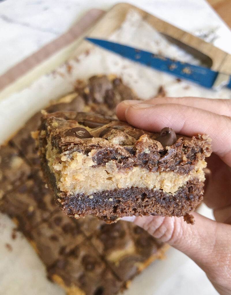 Spread about two thirds of the brownie mixture into your prepared pan, making sure you get it into the corners and along all of the edges. Smooth the entire peanut butter cream cheese mixture on top and follow it up with the remaining brownie batter. Give it one more hit of chocolate and sprinkle it with chocolate chips!