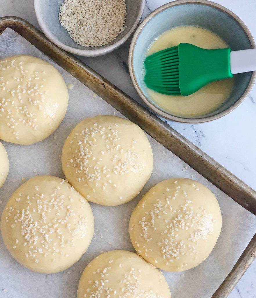 - Use the same method for shaping, but when you place the roll on the baking sheet, slightly flatten it with a floured hand. Cover and allow the buns rise about 50% in size. Brush with an egg wash and sprinkle on some sesame seeds or Everything Bagel Seasoning if desired. Bake until golden.