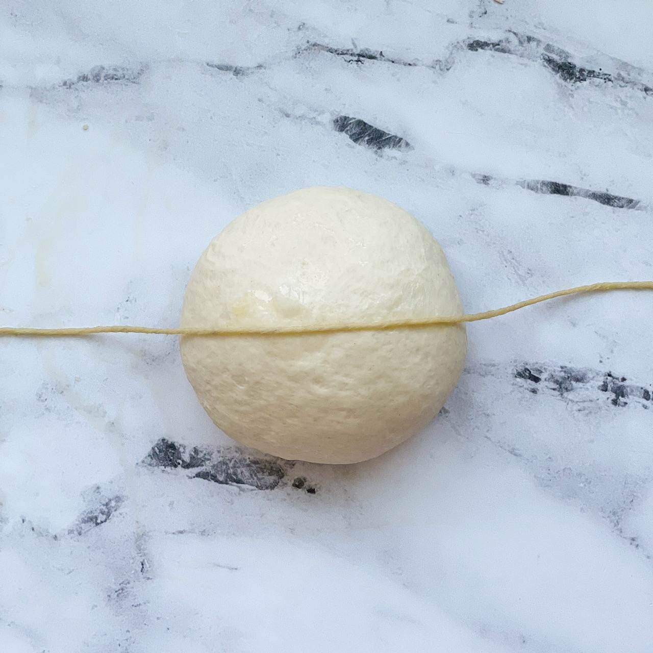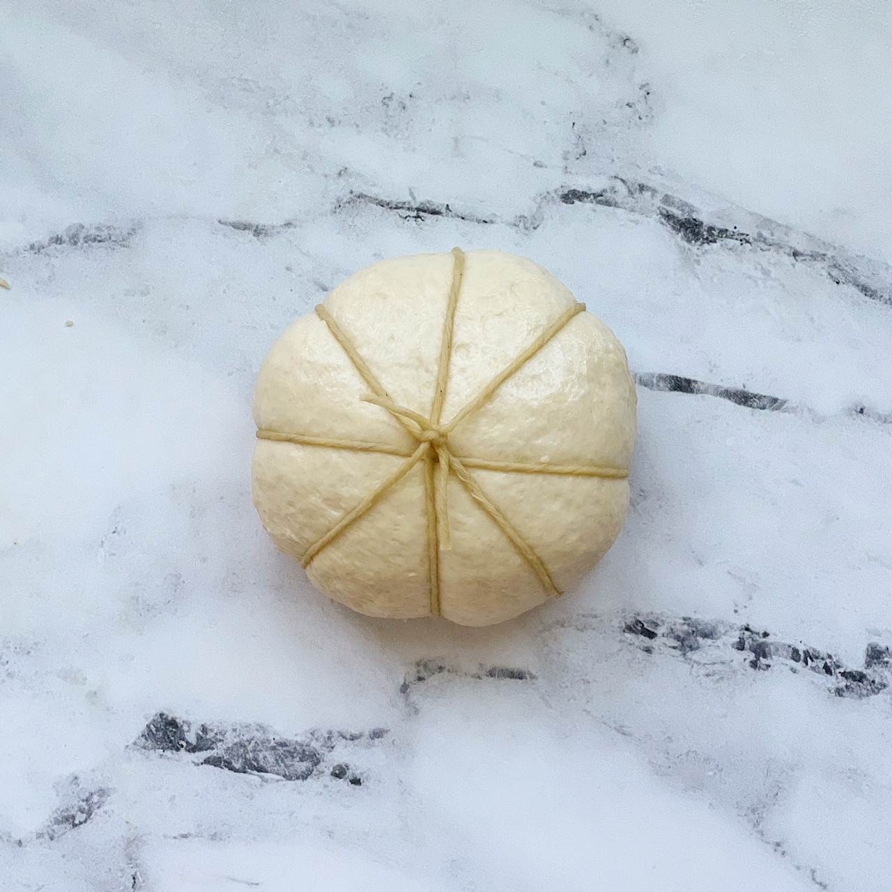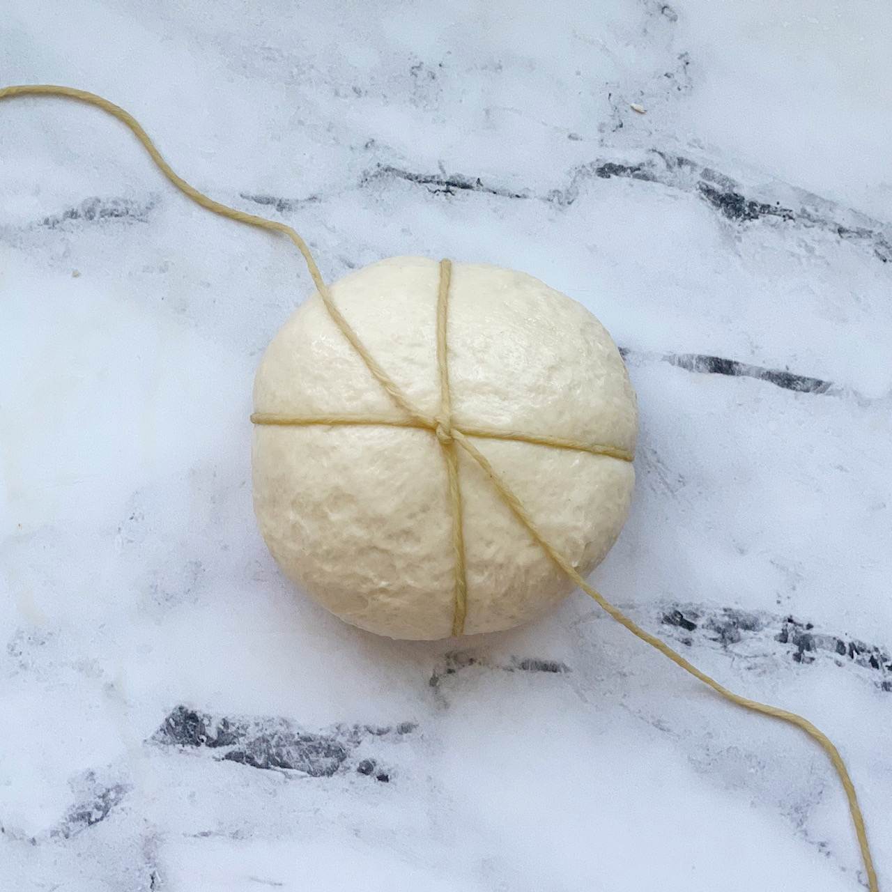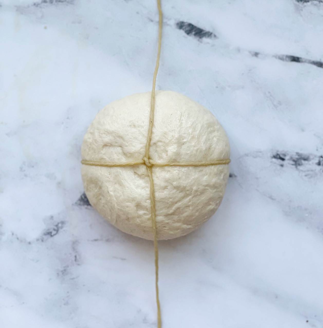 - Wrap the dough: Find the middle of the piece of twine and place it over the center of the dough ball horizontally. Flip the dough over and bring the ends of the twine together. Tie a double knot in the center of the dough ball, making sure not to pull the twine too tightly around the dough. Take the ends of the string and arrange them vertically (in the opposite direction as the twine you just double knotted). Flip the dough back over, bring the ends up and tie another double knot in the center, loosely wrapping the twine around the dough. Arrange the ends of the twine diagonally, flip the dough over and bring the ends together. Tie a double knot. Arrange the ends of the twin diagonally in the opposite direction. Flip the dough over and bring the ends together, tying a double knot again in the center. Cut off the excess string. You should now have a dough ball that is wrapped with twine, creating eight sections.