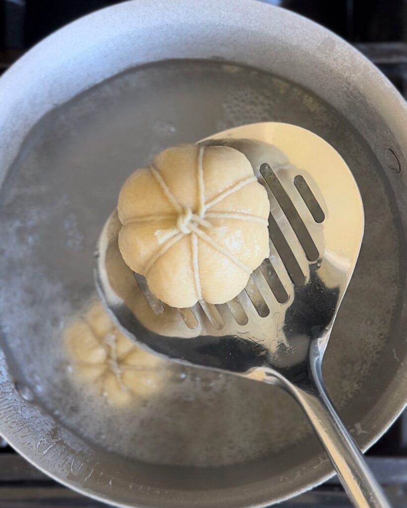 - Remove them from the water and place them on the prepared baking sheet. You’ll notice that the rolls expand a bit during this process (another reason you don’t want to wrap them too tightly with the twine).