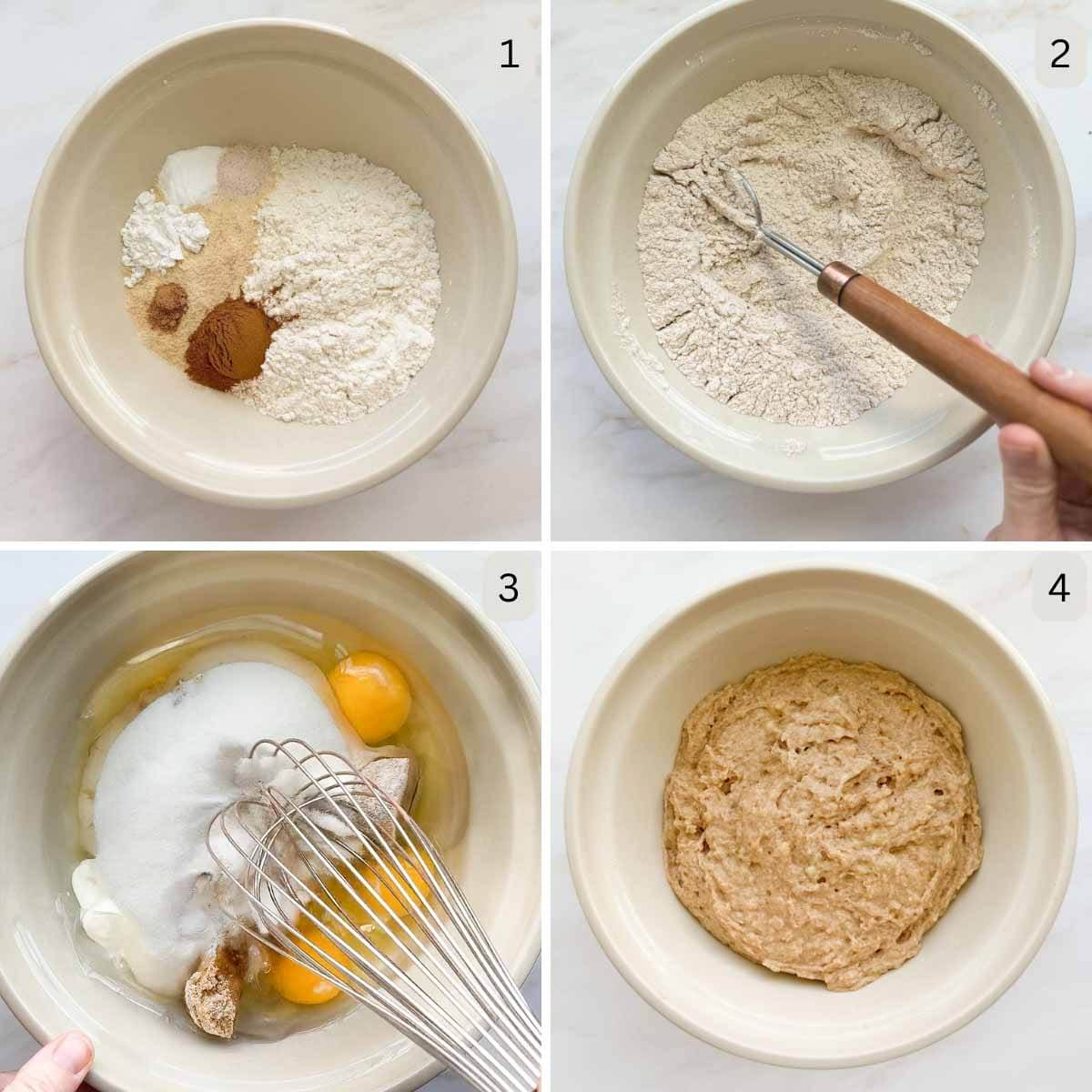 - In a separate bowl, whisk together the eggs, Greek yogurt, oil, honey, vanilla, and mashed banana.