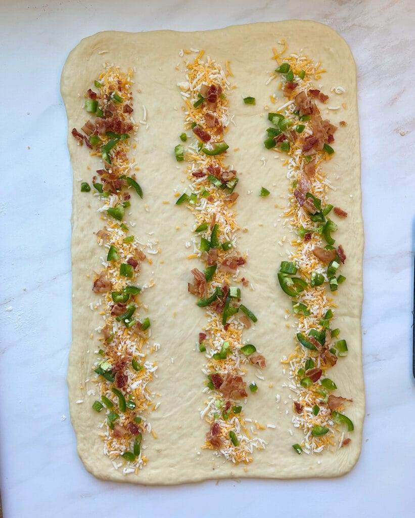 - Layer the cheese, jalapenos and bacon in three rows along the length of the dough. Each row should have a two-inch border. With a pizza cutter, cut the dough between each row of filling. You’ll make two cuts, dividing the dough into three strips.