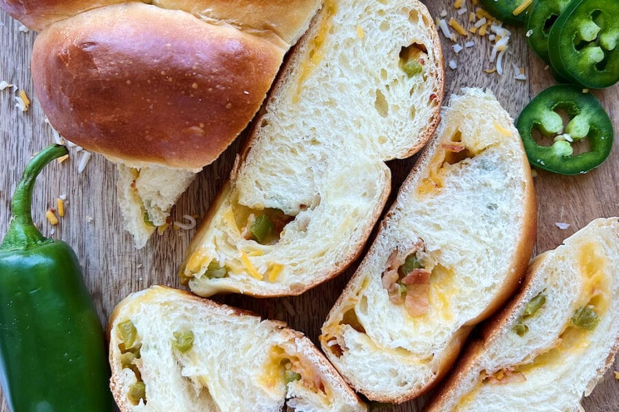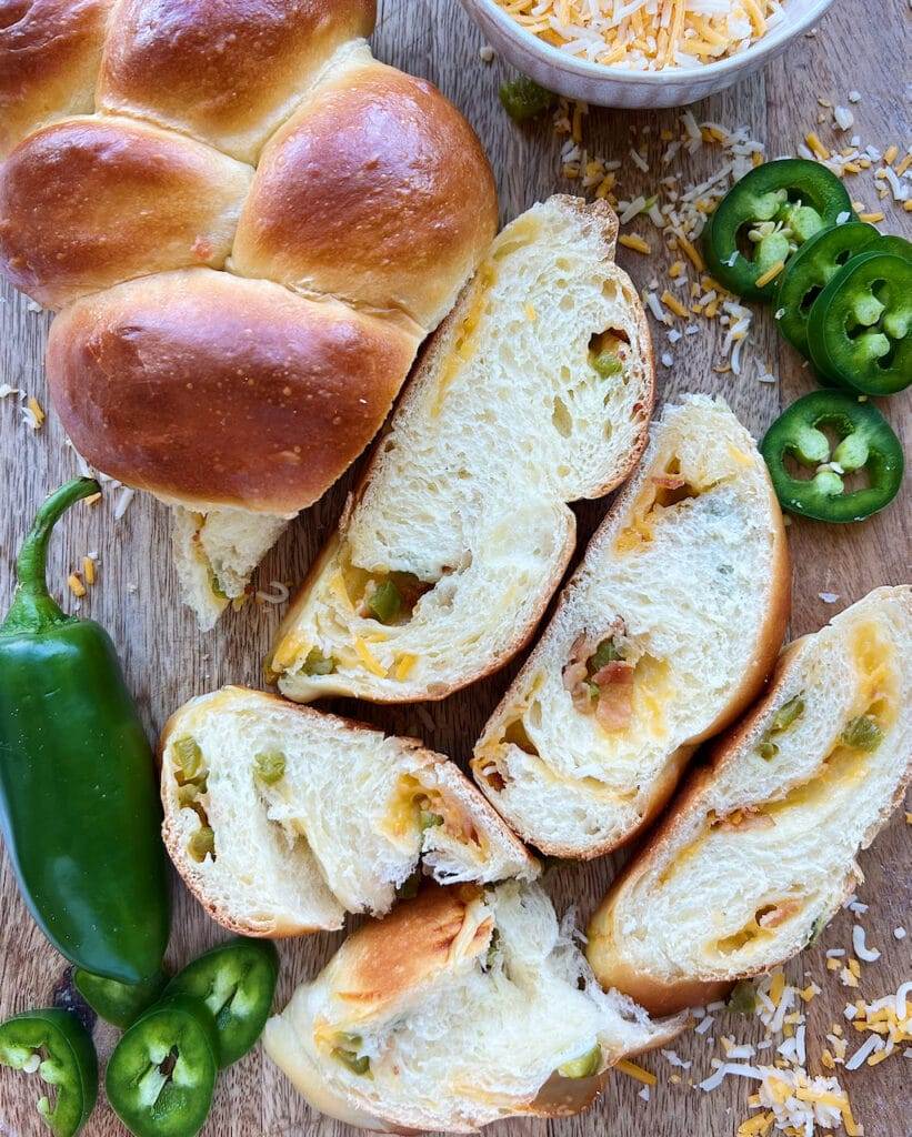 In developing this recipe, I wanted there to be a maximum amount of filling in each bite. I came up with this idea to make a braided loaf, with each of the braids filled with cheese, jalapenos and bacon. The results were incredible! Not only is there a generous amount of filling in each slice, the braided bread bakes up so beautiful!