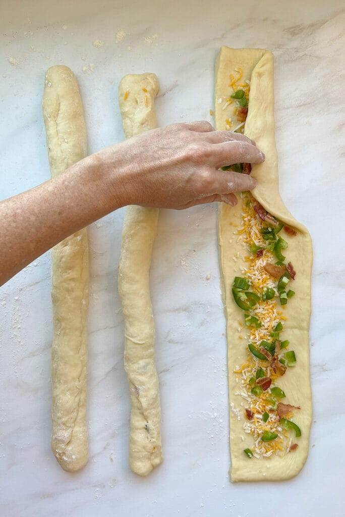 - Carefully roll up each strip of dough lengthwise. Pinch the seams of the dough shut to keep it from opening. You’ll end up with three long ropes of filled dough.