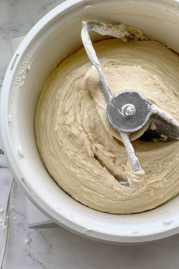 This dough is really easy to mix up. I typically double this recipe and make it in my Bosch mixer (my number one go-to mixer for all of my bread recipes!). If you do not have a larger mixer like a Bosch, you can easily make this in a stand mixer like a KitchenAid too! If you don’t have a stand mixer, you could use a hand mixer until you get to the end stages and then you would need to work in the remainder of the flour by hand.